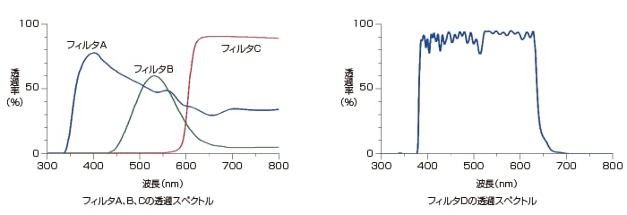 フィルタは目的波長域の光を透過させる役割を持ちます。フィルタA、B、Cはそれぞれ赤、緑、青、フィルタDは可視域に透過特性を持つフィルタであることが確認されました。