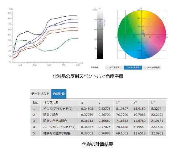 色彩計算結果は、色度座標へのプロットが可能です。標準的方法(波長範囲360~830 nm、1 nm間隔)や実用的方法(波長範囲380~780 nm、5 nm間隔)のスペクトルを用いて、光源や視野などのパラメータを設定し、色彩計算を行います。