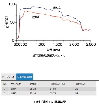 日本産業規格(JIS K5602-2008)に規定されている塗膜の日射反射率の求め方および日本産業規格(JIS K5675-2011)に規定されている屋根用高日射反射率塗料に関する試験方法(日射反射率)に準拠した計算が可能です。