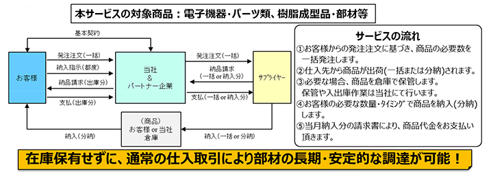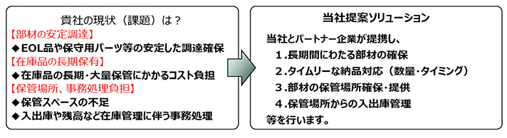 近年、メーカーの生産中止への対応や自動車向け保守パーツなどが増加しており、急な部品手配や在庫が必要になったり、保管場所の確保にお困りではないでしょうか? 当社ではパートナー企業と連携し、お客様の安全調達ニーズに対応した長期供給継続サービスを提供します。