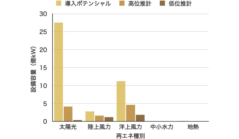 <図1>に、発電に関して再エネ種別ごとに、導入ポテンシャルと、経済性を考慮した導入ポテンシャル(高位推計および低位推計)について設備容量(億kW)をグラフに示しました。