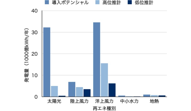 ところで、2019年度における従来型発電と再エネ発電を合わせた発電量の合計は約1兆kWh/年です。すなわち、再エネ発電の低位ポテンシャルは現状の日本の全電力消費量と同等ということです。高位ポテンシャルでみれば現状の電力消費量の2倍となります。
