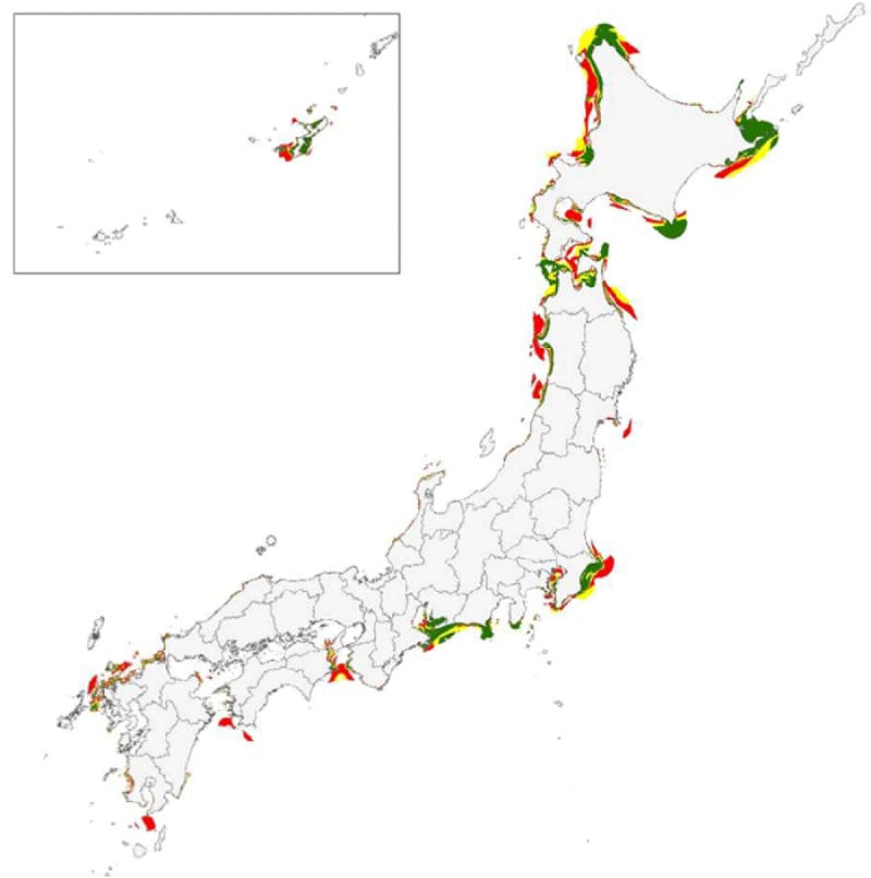 ここで、再エネの導入可能な立地は、必ずしも日本全国満遍なくとはなっていない点に注意が必要です。<図3><図4>にREPOSによる陸上風力発電と洋上風力発電の導入可能量の地理的分布を示しました(参考文献3)。図中の色分けは低位〜高位の推計に対応しています。