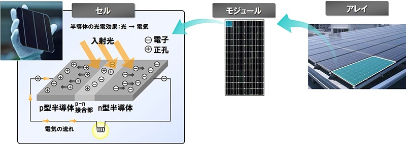 「セル」は太陽電池の基本単位であり、15cm×15cm程度の大きさです。セルは、<図1>のように電気的な性質の異なる2種類(p型、n型)の半導体を重ね合わせた構造をしています。太陽の光が当たると、電子と正孔が発生し、正孔はp型半導体側へ、電子はn型半導体側へ引き寄せられます。このため、表面と裏面に形成した電極に電球のような負荷をつないだ場合は電流が流れます。この太陽電池セルの電流値は日射強度に比例し、太陽電池セル1枚の出力電圧値は約0.6Vとなります。