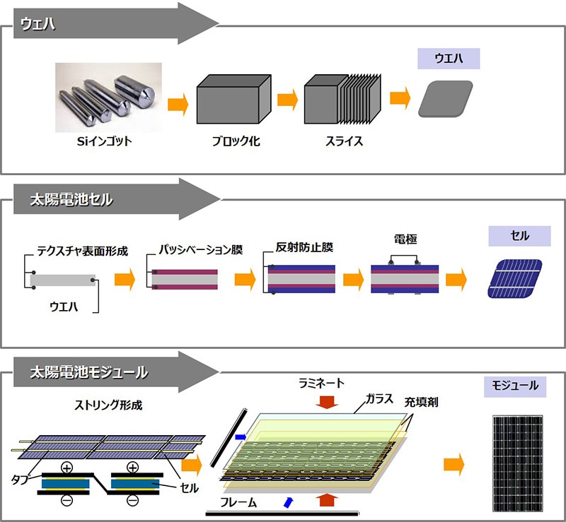 太陽電池モジュールは<図2>のプロセスを経て製造されています。
