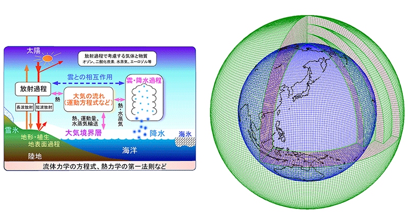 気象予報では、地球を模擬したシミュレーション技術を用いて予測しています。これを「数値予報モデル」、「気象予報モデル」と呼んでいます。基本方程式は流体力学でも登場するナビエ・ストークスの運動方程式(Navier-Stokes equation、微分方程式)、熱力学の第一法則などです<図1左>。微分方程式には時間発展の項があるので、将来を予測することが可能になります。数値予報モデルにおいては、基本的な大気の流れや気温、気圧などの予測のほか、陸地の分布や海面水温、海氷、土地利用の情報なども含めてモデル化を行っています。