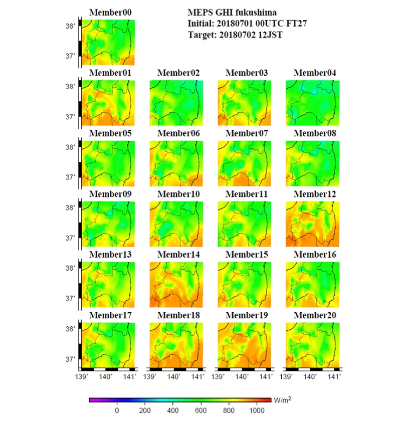 <図3>は福島県を対象としたメソアンサンブル予報による日射量予測の一例です(2018年7月1日の朝9時に27時間先の翌日12時の予測を行ったもの)。この予報結果のばらつきが小さい場合は、「各予報の信頼度が高く、予測精度が高い可能性がある」と言えます。一方で、予報結果のばらつきが大きい(さまざまなシナリオが想定される)場合は、「各予報の信頼度が低く、予測精度が低い可能性がある」ことを意味します。