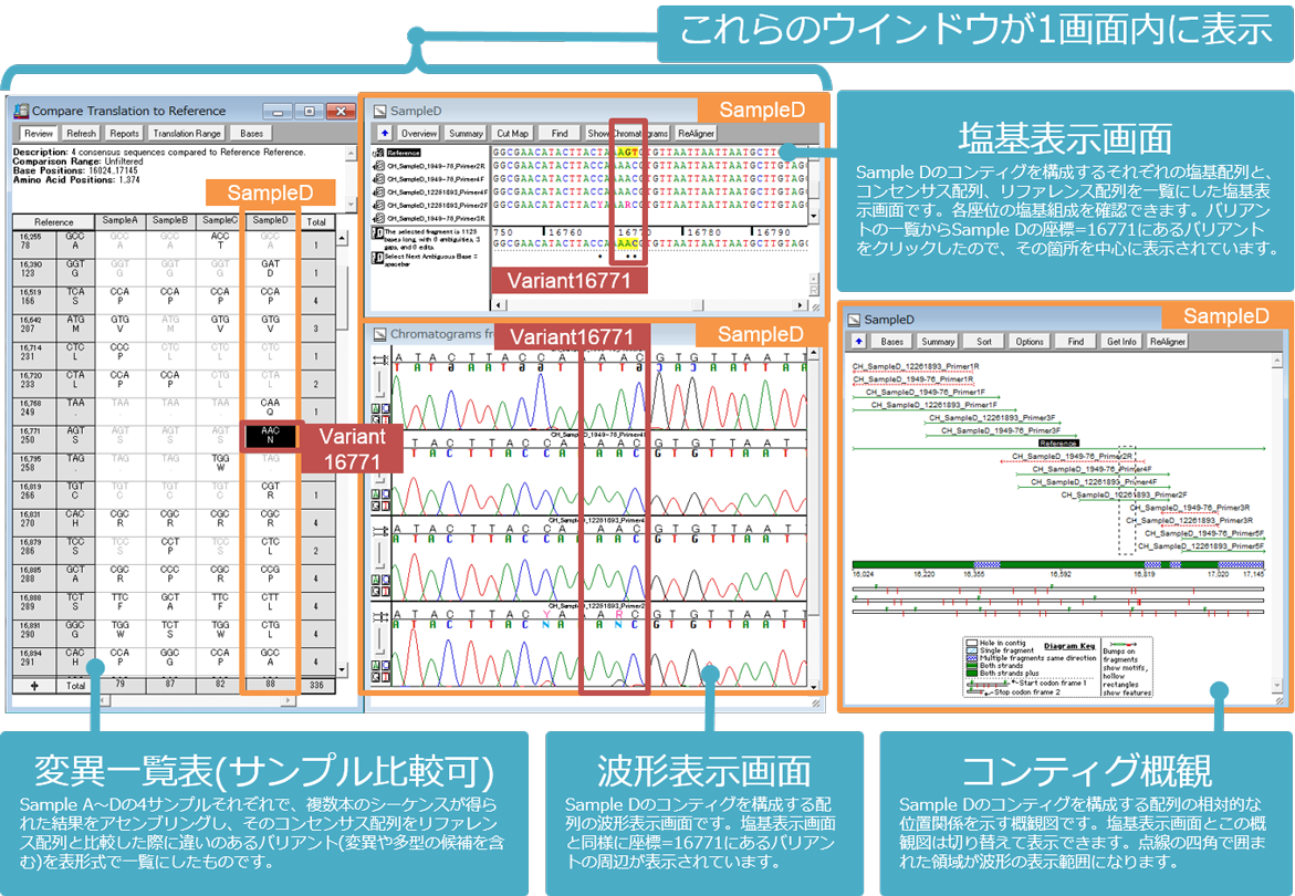 波形と配列データを取り込み、複数の配列を束ねてコンティグの作成や、変異や多型の候補箇所の一覧の作成ができます。 コンティグを構成する配列の波形を並べて確認、リファレンスと異なる箇所、配列間やサンプル間で違いのある箇所を直感的な操作で確認ができるので、効率的に配列の妥当性確認を行えます。