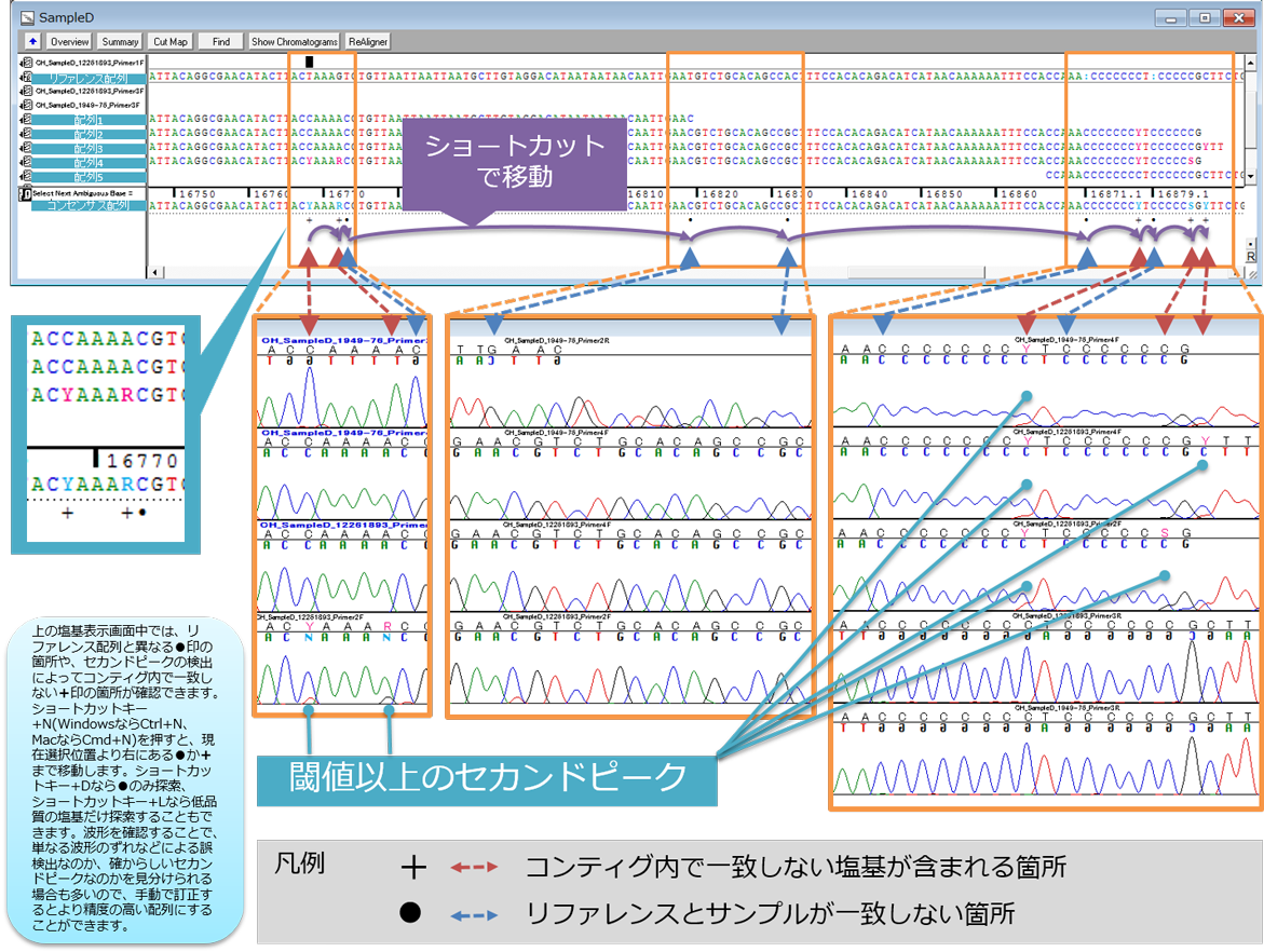 ショートカットキーを用いてリファレンスと一致しない箇所、コンティグ内で異なる塩基を持つ箇所をボタンひとつで移動できます。移動する際は、塩基表示画面と波形表示画面が連動して表示されます。この機能を用いて、確認が必要な箇所だけ効率的に波形を確認し、誤った箇所をその場で手動編集することができます。