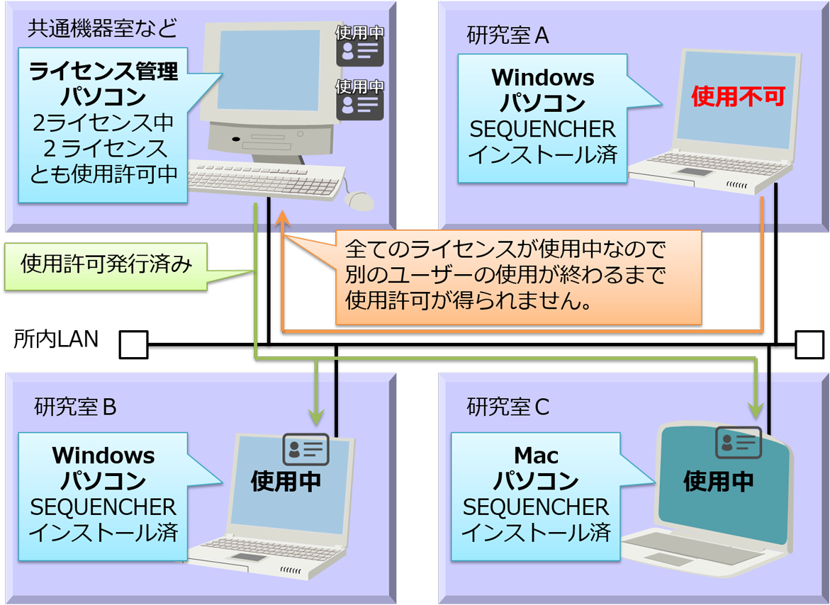 * ライセンス管理パソコンとは、ライセンスサーバー(ネットワーク版SEQUENCHERの利用許可を与えることのできる専用のソフトウェア)をインストールしたパソコンです。