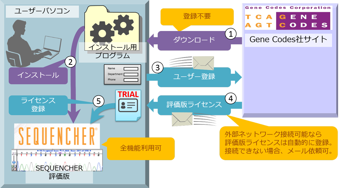 評価版(スタンドアローン版)は、製品版(スタンドアローン版)のすべての機能を15日間限定で無償で利用できるライセンス形態です。ライセンスの発行のためには、ソフトウェア製造元(米国Gene Codes社)へのユーザー登録が必要です。導入手順は'評価版(スタンドアローン版) 導入手順'をご覧ください。評価版(ネットワーク版)はありません。