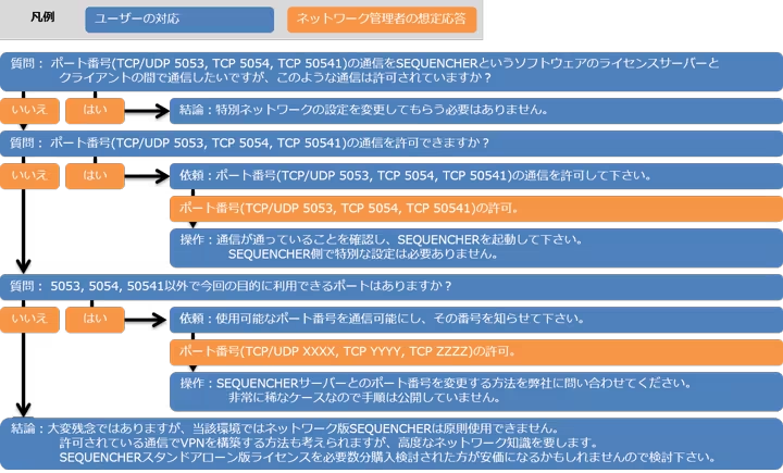 A: ユーザーがSEQUENCHERとライセンスサーバーをインストールするコンピューター間で必要な通信が許可されていれば良いため、必ずしも特別な設定が必要でない場合もあります。しかし、セキュリティ方針の厳しい研究所や企業などではネットワーク管理者様に必要な通信を特別に許可する依頼を行う必要がある場合が多いようです。初期状態で通信が許可されていない場合は、一般的にネットワーク管理者が設定変更に対応しない限り、ネットワーク版をご利用になることはできません。以下の必要なネットワーク上の設定についてネットワーク管理者様に予めご確認ください。