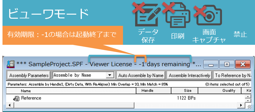 データの保存、印刷、画面キャプチャなどの機能が制限された起動モードです。以下のようにプロジェクト画面のタイトル部分に、’- Viewer License – X days remaining’と表示されたら、ビューワモードに切り替わったことを意味します。Xの部分はビューワモードの有効期限(日数)を意味し、’-1’の場合は起動終了までしか使用できません。