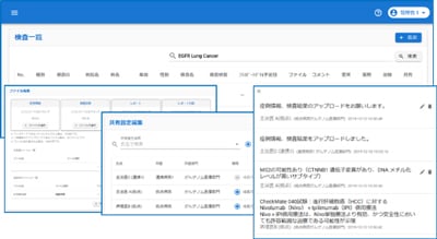 症例情報や検査結果などの多様なデータやファイルを症例に紐づけて共有可能