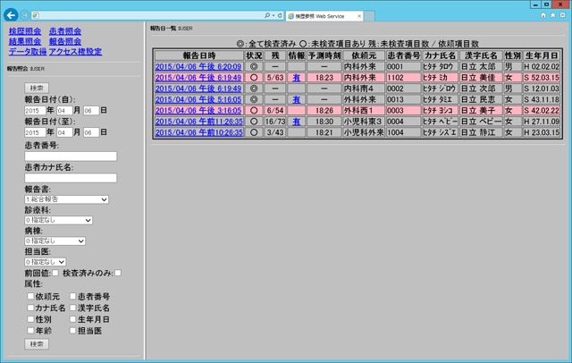 常に最新の状況を自動表示するので、検査の進捗をリアルタイムに把握することが可能です。日付、患者番号、診療科などの絞り込みが可能なため効率よく検索することができます。
