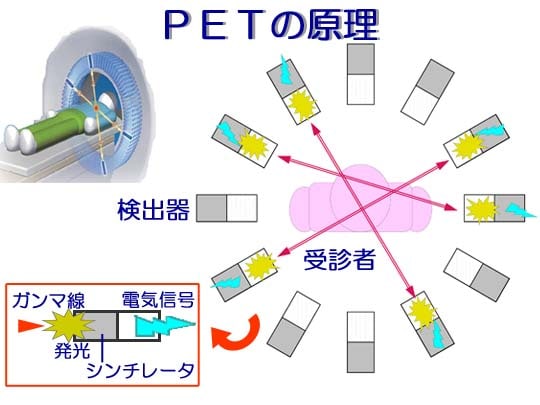 PET薬剤から放出されるガンマ線は、互いに180度反対方向に2本同時に放出されます。ガンマ線はシンチレータにより捕捉され、光に変換されます。この光を電気信号に変換し、画像処理を行うことで、PET画像が得られます。