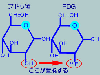 PETで使用する検査薬は200種類以上ありますが、がん検査に最も多く用いられるのがFDG(18F-フルオロデオキシグルコース)と呼ばれる検査薬です。FDGはブドウ糖と同じ構造を持つ物質で、図に示すようにブドウ糖分子の1つのOH基が、陽電子を放出するフッ素の放射性同位元素18Fに置き換えられたものです。