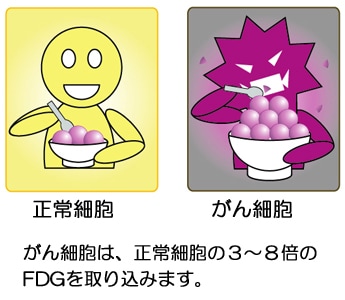 通常、がん細胞は、正常細胞よりもブドウ糖の消費量(代謝量)が3~8倍多いと言われています。ブドウ糖類似のFDGもブドウ糖と同様に正常の細胞と比べてがん細胞に多く集まると考えられます。