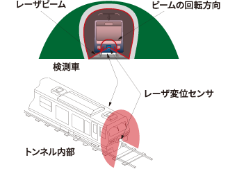 レーザが走行車体の周囲を回転。上空、軌道面も検出可能