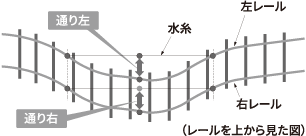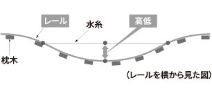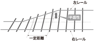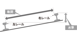 レールは車両が走行する際の大きな荷重や衝撃にさらされており、安全走行を維持するために定期的に検査し修復を繰り返します。当社装置の検測項目は「高低差」「通り(左右方向のずれ)」「軌間(レール幅)」「水準(左右レール高低差)」「平面性(ねじれ)」。すべて鉄道事業者の管理基準に準じています。