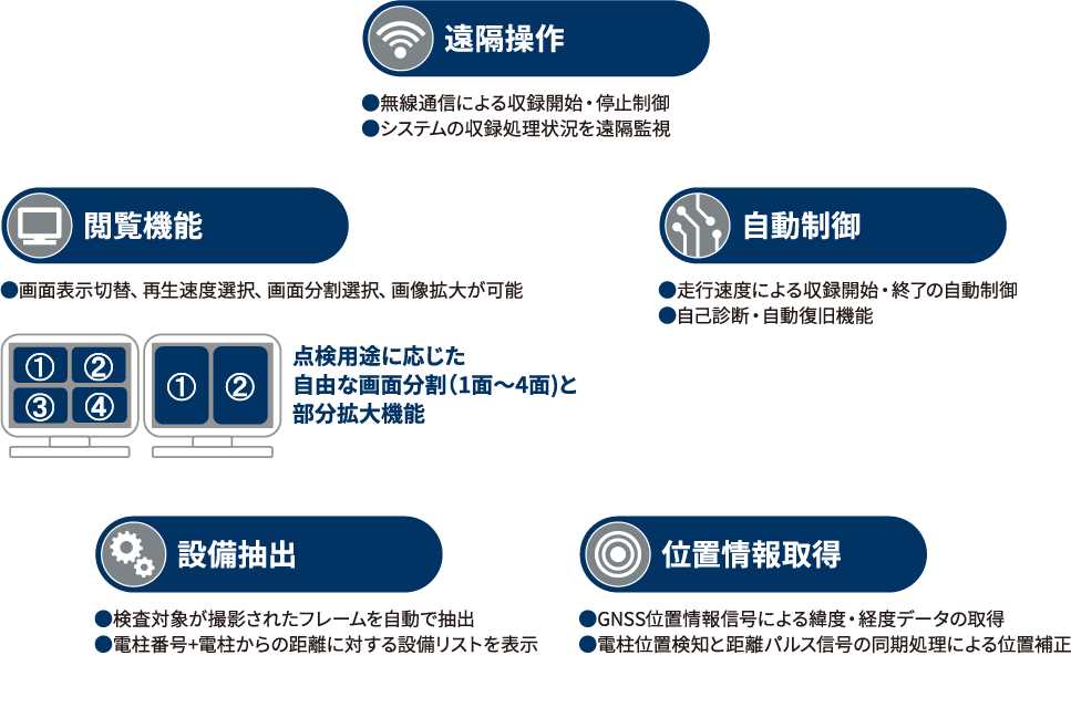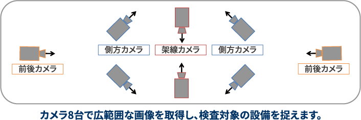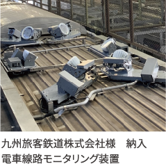 営業車の屋根上に搭載したカメラにより、予め任意に設定した収録スケジュールに対応して、動画撮影します。カメラは4Kを採用し、トロリ、ハンガー、コネクタ等の電車線や、曲引き、張力装置などの設備を高精細な画像で収録します。画像と同時にGNSS情報を取得し、設備の位置が把握できます。収録した画像データは地上処理装置で処理し、簡単な操作で検査作業が出来るアプリケーションにより、検査業務の省力化を実現しました。
