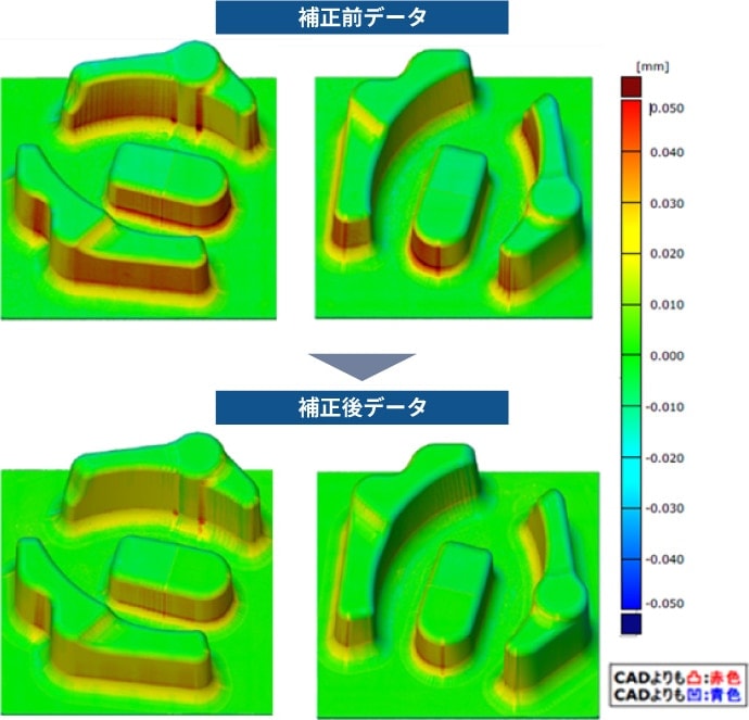 中難易度の金型コア部品を、これまでのNCデータと補正後のNCデータで加工。それぞれの完成品をCADデータとの比較で誤差を算出した。補正後データが明らかに誤差が出ていないことがわかります。