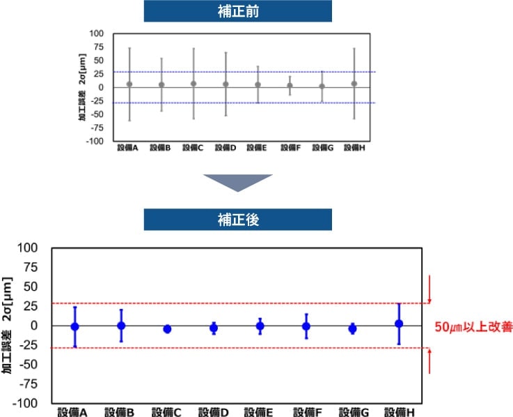 日立グループ内の複数設備で、同一NCデータを用い加工誤差を測定。その後、本サービスを使用した補正NCデータで再度、加工誤差を測定しました。各設備とも精度向上が見られ、これにより複数の設備や拠点で同様の高精度な加工が可能となりました。