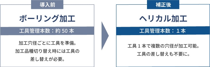 従来、高精度な穴加工ではボーリング工具を使用していましたが、穴径ごとに工具を用意する必要がありました。NCデータの補正により、ヘリカル加工でも高精度な穴を加工可能になり、加工品種切換えに伴う工具の差し替えや調整が不要になります。また、補正により精度を維持したまま速度を向上可能なため、ヘリカル加工時間の短縮も見込めます。