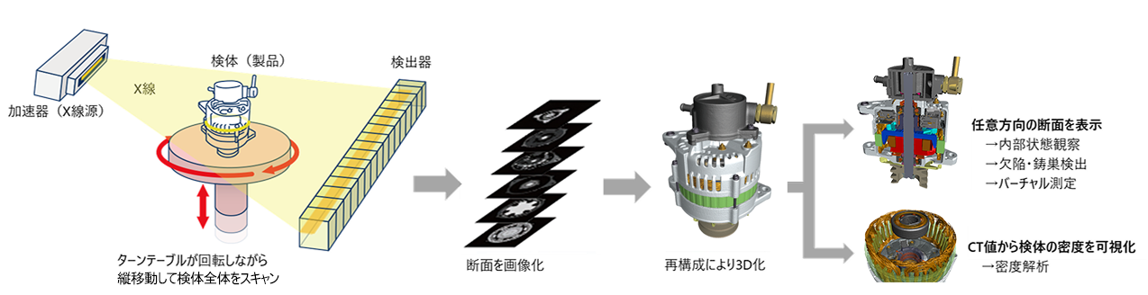 上図は、長さ300mをもつ材質の違う試験体を、X線エネルギーの違いにより撮像した事例です。X線エネルギー9MVの場合には、SUS製試験体を十分に透過できておりアーチファクトの発生はありませんが、1MVの場合には、SUS製とTiN製の試験体で透過力が不足しておりストリークアーチファクトが発生しています。
