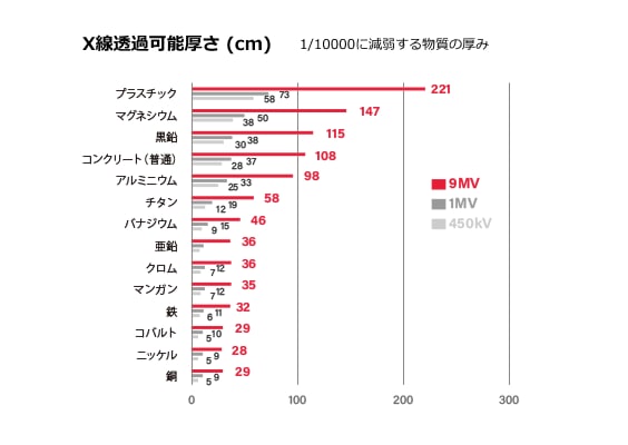 例えば、アルミニウムは96cm、鉄は32cmの厚さまで透過することができます。