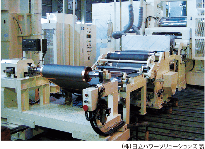 | ③ | プレス | 正極材、負極材をそれぞれローラーで圧縮し、決められた密度(厚み)に成形する。 成形後は再びロール状に巻かれる。 |