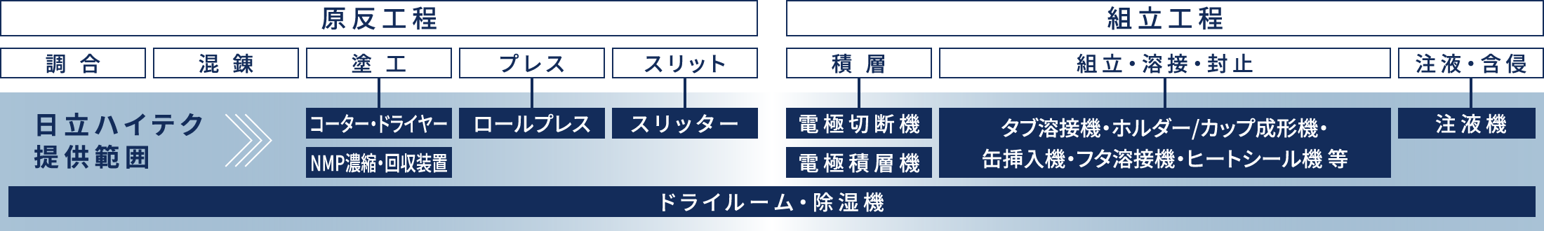 リチウムイオン電池の製造工程において、ドライルーム技術は重要な役割を果たしています。リチウムイオン電池の製造では、水分の混入は厳禁です。空気中の水分にも注意が必要で、少しの水分が性能低下や劣化をもたらすため、湿度がほぼ0%の低湿度環境にて製造します。また、ドライルームはCO2排出量の削減にも寄与しており、持続可能な製造プロセスとして注目されています。日立ハイテクが提供するドライルームは、水分コントロール技術やCO2除去技術など競争優位性を発揮するコア技術を擁し、高気密配管や建材の選定を含む高性能なドライルームの設計に対応しており、高効率且つ省エネルギーでのリチウムイオン電池の製造が期待できます。