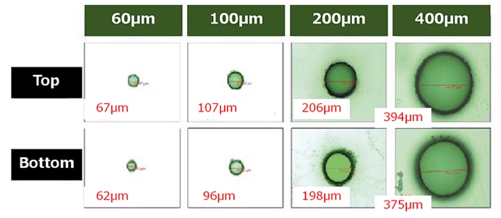 - 『広範囲加工』: 特殊光学系を応用したレーザラインスキャンにて広範囲加工が可能
