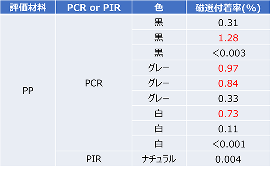 注意点として、PIR(Post-Industrial Recycled)の方がPCR(Post-Consumer Recycled)よりもばらつきが小さいと考えがちですが、PIRにおいて、お客様の要望を満たすために、複数種類のソースを混ぜるケースが多く、その管理が不十分な場合は、PIRでもPCRよりばらつきは大きくなる場合があることです。また、PCR材については、ソースに依存しますが、一般的に世の中で多く使用されている家電由来PCRは、金属異物が多く入っております。