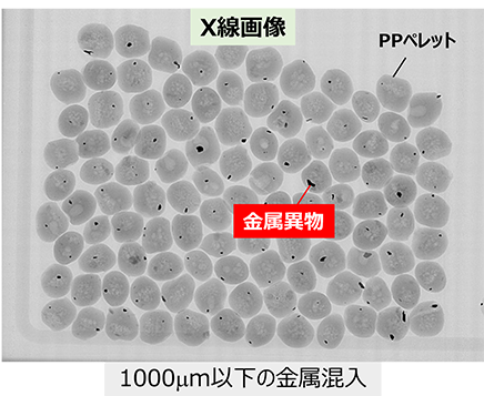 金属異物は25kgの1袋で評価しており、図1の右のX線画像は、評価した材料で金属異物が入っていると検知したペレットです。通常、押出前に設置することが多い磁石では、検知不可能な100μm-1mm長の金属異物も検知している例として示しております。
