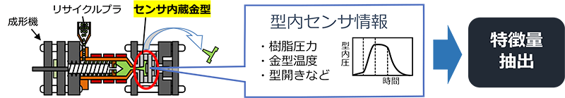 リサイクルプラスチックのロットばらつき評価には、金型センシングを用いた特徴量抽出を用います(図2)。評価には、弊社で準備した独自のセンサ内蔵引張試験片金型を標準型として使用します。