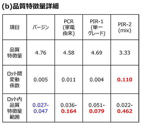 この結果から分かることとしては、国内メーカーのバージンに対して、家電由来のPCRは、ロット間で2.2倍、ロット内で3.5倍、PIR-1(単一グレードのため最も高品質なリサイクルプラ)は、ロット間で同レベル、ロット内で1.7倍、PIR-2(量の安定性を重視し複数のソースが混ざったリサイクルプラ)は、ロット間で22倍、ロット内で9.8倍のばらつき量であることです。特に、PIR-2を量産に適用する場合は、不良のリスクが非常に高いことが分かります。