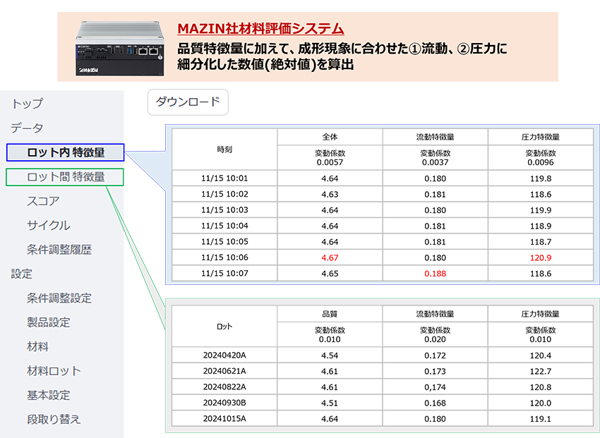 量産で使用する場合は、不良解析の特定のみならず、取出し機に連携することで、不良の自動搬出も可能となります。その場合、特徴量の絶対値に対しての閾値はお客様で設定していただくことになります。また、MAZIN社の既存システム(成形の自動調整機能)により、成形不良低減にも貢献できる可能性もあります。