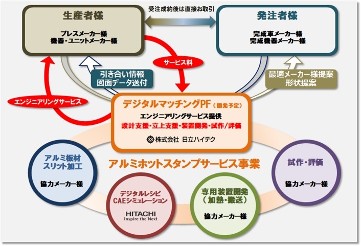 日立ハイテクのサービスを利用し、生産者様は、発注者様(完成車メーカー、完成機器メーカー様)と直接お取引をして頂く事で競争力のあるアルミホットスタンプ部品を供給頂くことができます。