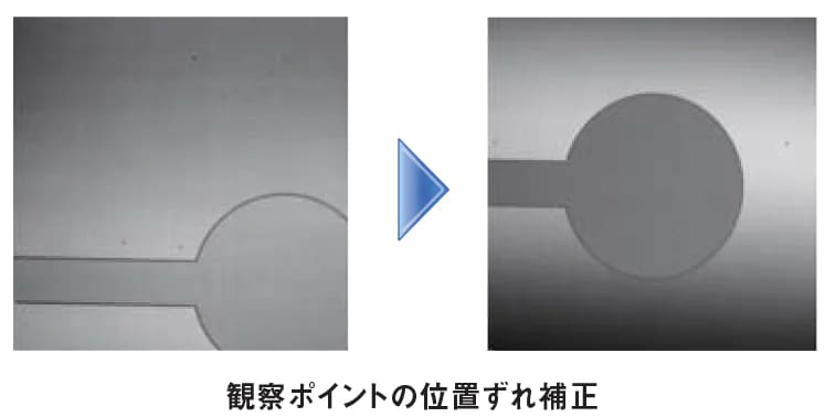 XY電動ステージと電動レボルバ装着時に搭載されるパターンマッチング機能との組み合わせによって、自動多点測定時の位置ずれ補正が行えます。 微細部位へのピンポイント自動測定を実現します。