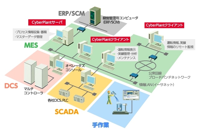 MESソリューションパッケージCyberPlantは製造プラント全体を効率化することを目的とするプラント管理用のソフトウエアです。 製造現場には生産データや運転員、製造スタッフの大事なノウハウがありますが、CyberPlantにより、このような情報を可視化・電子化して活用できます。 またCyberPlantは基幹情報システムと、DCSなどのプラント制御システムの中間に位置し両者を有機的に結びつける役割もあります。