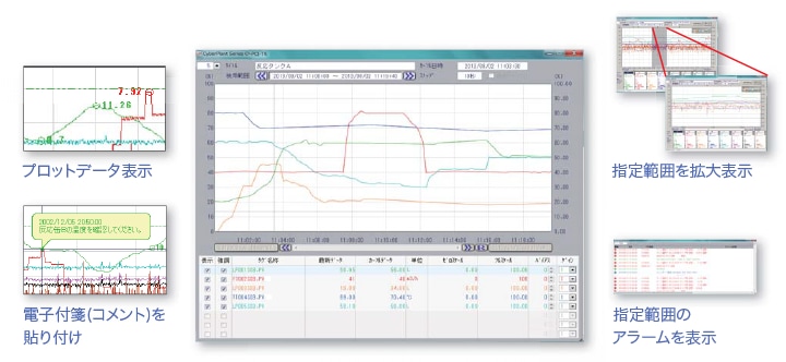トレンド:プロットデータ表示、電子付箋、拡大縮小、指定範囲のアラーム表示