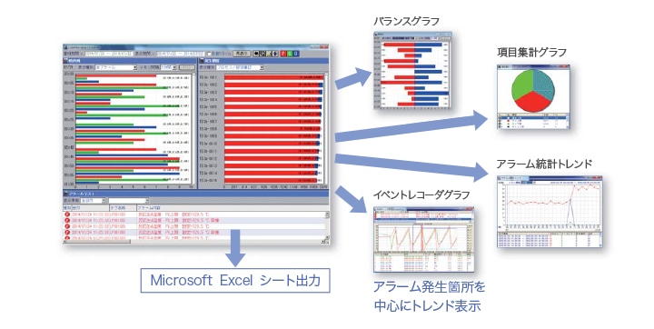 - 時系列、バランス、統計など多種グラフにてアラームをマルチ表示・解析