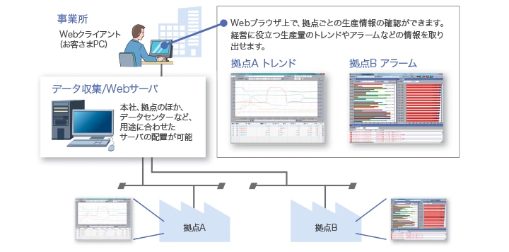 - 複数工場のトレンド、アラーム情報をWebブラウザ上で閲覧
