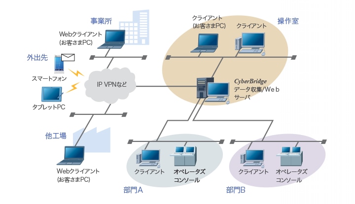他工場や工場外拠点にクライアントマシンを配置することで、製造部門を超えたシステムの構築が可能です。