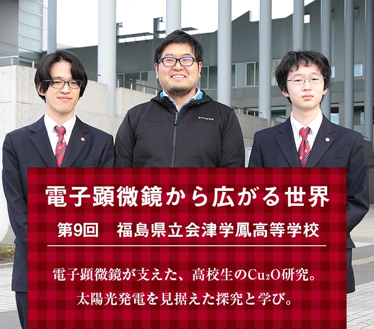 今回は、SSH探究部化学班でこの研究に取り組む中川太玖さん、出村胤英さんと、SSH探究部顧問の大橋謙太郎先生に、研究活動の内容や電子顕微鏡との出会い、その果たす役割などについて話をうかがった。