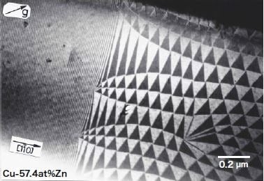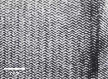 学位取得をきっかけに炭素鋼の焼戻し過程の研究を自主卒業し、結晶の中の自然美を求め、論文で見たγ-黄銅の長周期規則構造の研究をしていました。γ-黄銅の長周期規則構造の写真は今見ても幾何学的に美しく、またその自然の美には感動します。図3にCu-Znγ-黄銅に見られたストライプ状の1次元長周期構造と三角形タイル状の2次元長周期構造が共存した領域の電子顕微鏡を示します。