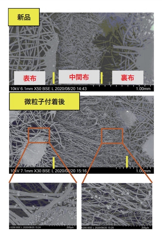 図2 不織布マスクのSEM像(反射電子)。新品と微粒子付着後(加速電圧 10 kV)