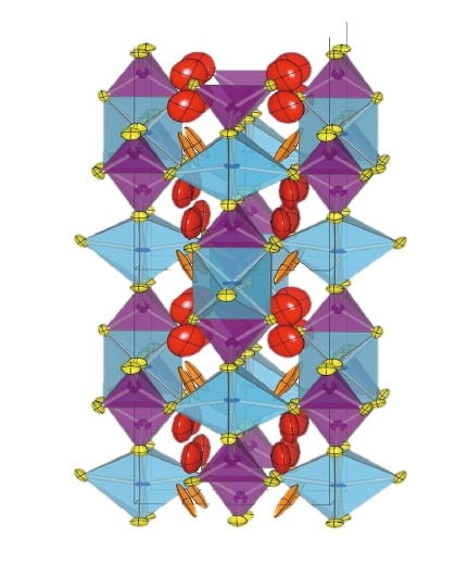 新しく見つかった結晶構造であり、リチウムのイオン伝導に最適な構造である。一次元と二次元の伝導経路中に、目一杯リチウムイオンが詰まって、連続して分布している。このような構造が、なぜ現実に出現するのか、非常に不思議である。