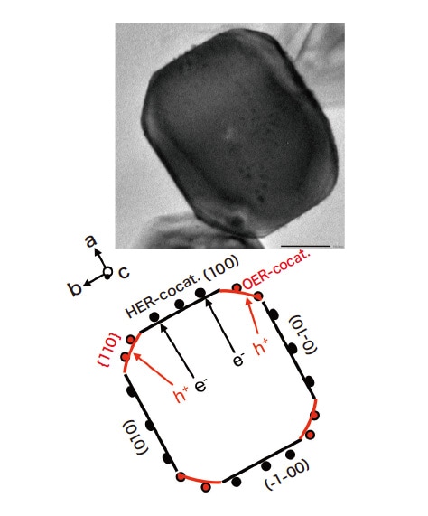微粒子光触媒(直径1 μm 前後)上で光照射により水素と酸素が2:1の化学量論比で生成することが確認されたのは、1980年であり、この年に3報の論文が報告されている。我々が報告した論文もその一つであるが、いずれも紫外光にのみ応答する光触媒であり、その量子収率も0.1% 前後であった。我々の光触媒微粒子は、チタン酸ストロンチウム(SrTiO3)を用いたものであったが、その後種々の改良を重ねた結果、2020年、紫外光照射下ではあるが(内部)量子収率がほぼ100% にまで到達することができた(図1)1) 。これは光励起によって生成した伝導帯の電子と価電子帯の正孔がほぼ100% の効率で、水を分解し水素および酸素生成のために使われたことになる。この光触媒の粒径は300 ~ 500 nm 程度である。すなわち、この粒子内で光吸収によって生成した電子と正孔は粒子内あるいは粒子表面で再結合することなく、ほぼ100% の効率で水素生成助触媒(活性点)と酸素生成助触媒(活性点)に自発的・選択的に各活性点に運ばれて、プロトン(H+)を還元し水または水酸化物イオン(OH−)を酸化して水素および酸素を発生したことになる。また、生成した水素分子と酸素分子から水分子へ戻る逆反応も進行しない。このような、電子と正孔の自発的・選択的表面活性サイトへの移動の原動力は、各面における仕事関数の差に由来する内部電場だと推察される。このことは、(100)面と(110)面の仕事関数の差を0.2 eVと仮定して行ったシミュレーションからも支持される。